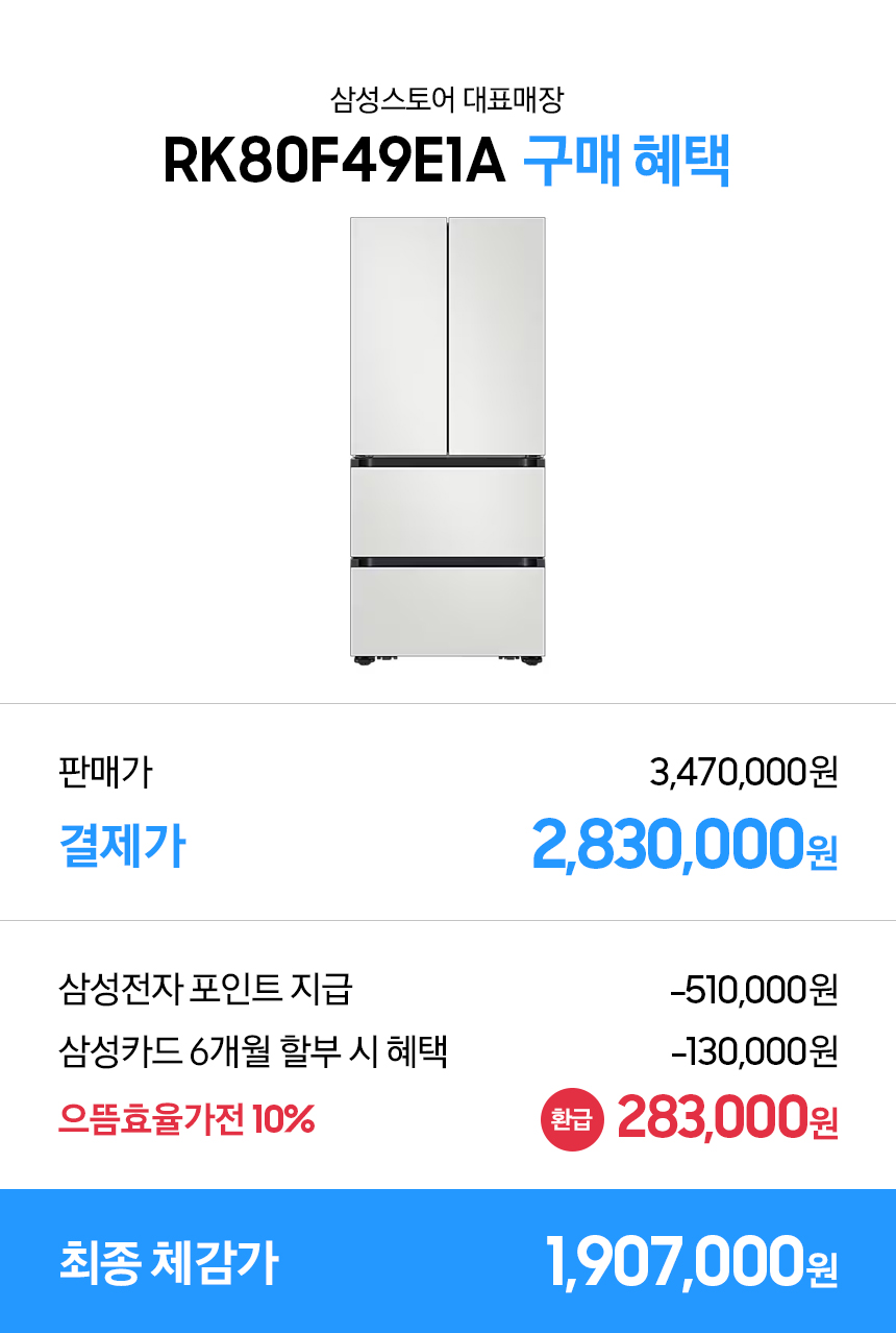 삼성전자 Bespoke AI 김치플러스 4도어 490L (메탈쿨링 선반) 420LRK80F49E1A